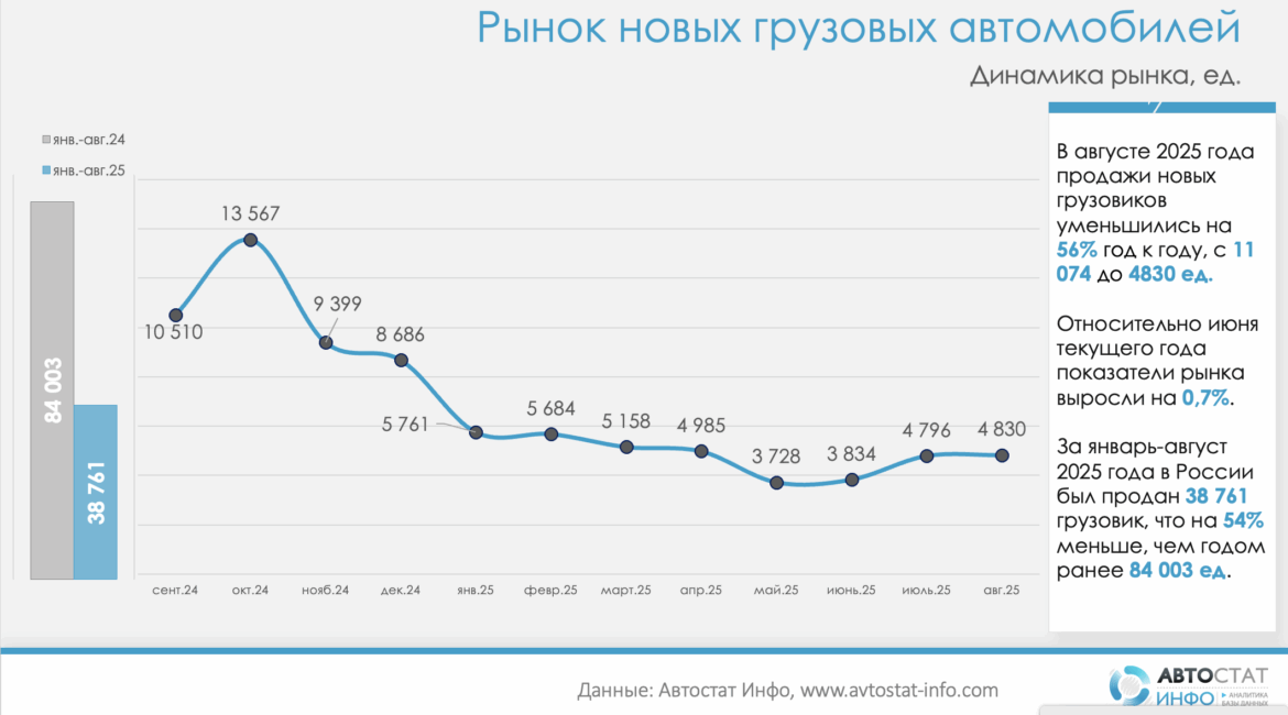 По данным «Автостат Инфо», в августе 2025 года российский рынок новых грузовых автомобилей сократился на 56% год к году — с 11 074 до 4 830 штук. К июлю зафиксирован технический рост лишь на 0,7% (с 4 796 шт.). Накопительно за январь–август продано 38 761 грузовик, что на 54% меньше...